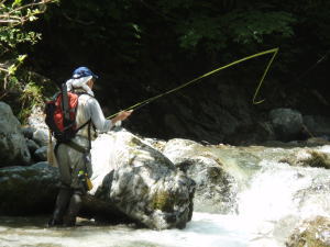 嫌な予感は的中し、今日もなかなか釣れない。日影では反応があるが、日向ではイワナがフライに出ない。出ても途中で引き返してしまったりする。暑くてイワナもいまひとつ元気がないようだ。