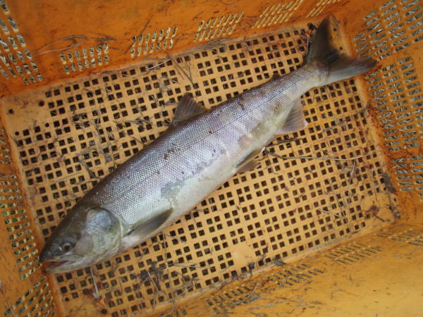 サケは力があるし、流れの中なので取り込みはそれなりにたいへんでした。