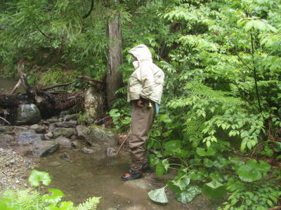 けっこうな勢いで雨が降っているので水がだんだんにごってくる。にごりのせいか大きめのフライに反応がいいようだ。