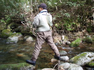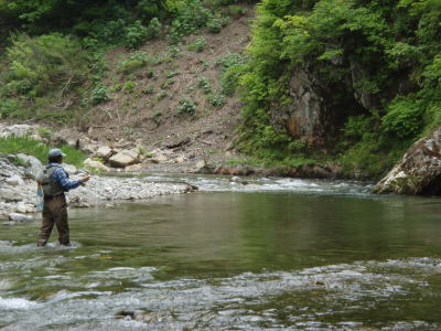 オーナーである一美さんの車に釣り道具を積んでG川に行く。ところが着いてみるとなんと先行者。こんな山の中なのによく来るなあ、などと自分たちのことは棚に上げて一美さんと感心する。