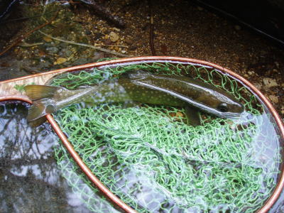 大きな魚は釣れなかったが、ここにはいるだろうというところにフライを流すと高確率でイワナが釣れる。短時間で10匹は釣れたと思う。