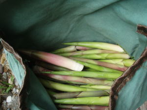 一美さんは釣りの途中でネマガリダケを採る。斜面を登って30分で60本近く採ってきた。すごい。