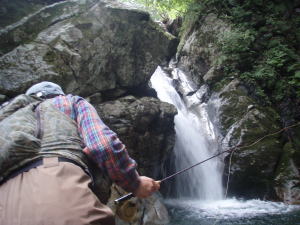 右下:私が釣った15秒後に一美さんが釣ったイワナ。