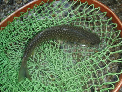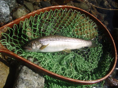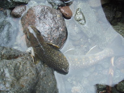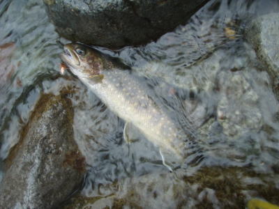 そのままフライを投げると、案の定、小さなイワナが釣れる。