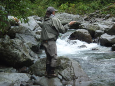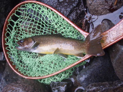 暖かい雨なのでイワナ達の活性は高い。しかしどうもうまく針がかりしない。使っているフライが大きいようだ。