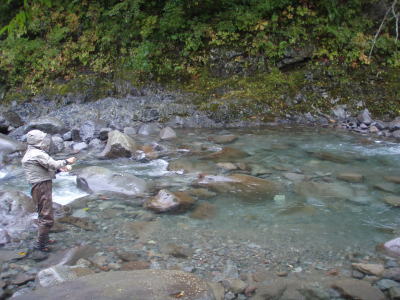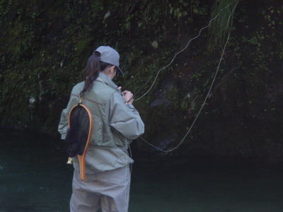 私からは角度が悪いのか魚影は見えないが、一美さんに魚の位置を教えてもらってフライをキャスト。フライは少し流れた後、ふっと消えた。