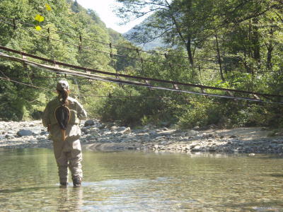 大きな淵の流れこみに魚が見えたのでフライを流す。3回目くらいに魚がフライをくわえたが、合わせるとなぜか抵抗もなく糸が切れる。