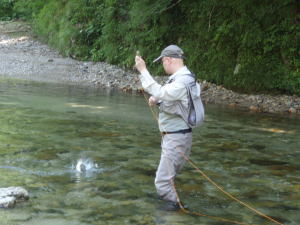 フライラインにリーダーを結びながら見ていると、Mさんはほどなく1匹釣りあげた。