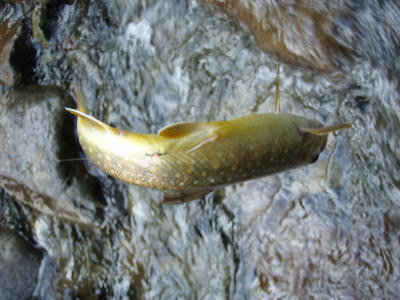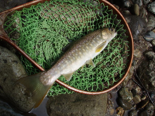 はあはあ言いながらフライを投げる。初めは小さいのしか釣れなかったが、やっと27センチイワナが釣れる。