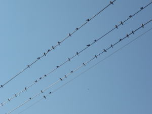 | 電線に群がるツバメたち。 この下には私の車が止めてある。 |