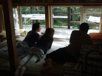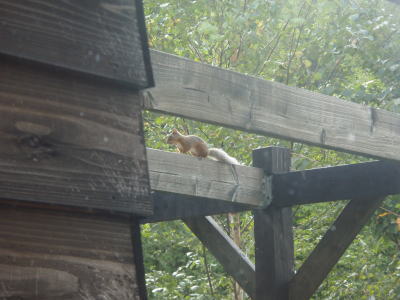 | (左)ライズのテラスに現れたリスと (右)それを一目見ようと集まった人たち。 なんてことのない写真だが、 左から浦口健次郎さん、バンブーロッドビルダーのチャコさん、御月家さんの旦那さんのMちゃんと そうそうたるメンバーだ。 |