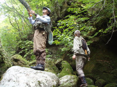 O川は広い川なので、ところどころで流れがいくつかに分かれている。そのひとつにさっちゃんと入った。前回来た時と同様に落ち込みごとにイワナがいて、さっちゃんと二人でサイトフィッシング。イワナがフライにくらいつくところが見えるのが楽しい。