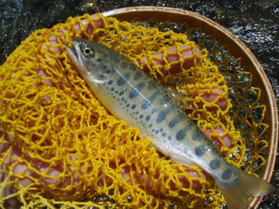 何度も空振りをくり返し、なんとかヤマメを1匹釣る。