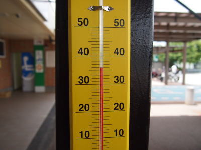 長野県白馬へ行く途中の高速道路。パーキングエリアの寒暖計は36度。