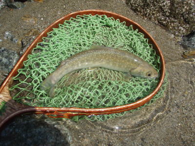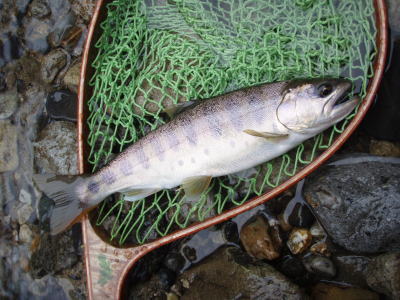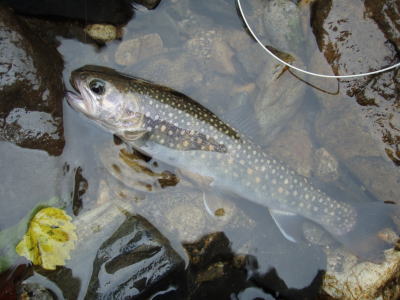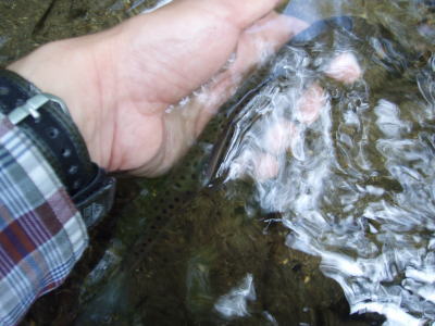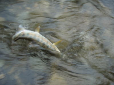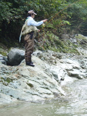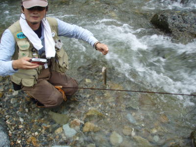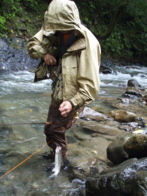 ものすごい手ごたえと共に下流に走ったので どんな大物かと思ったらスレ。 でも、いいヤマメ。 |