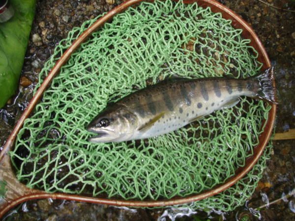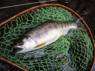 慎重にネットでヤマメをすくう。まあ、まともなサイズ。