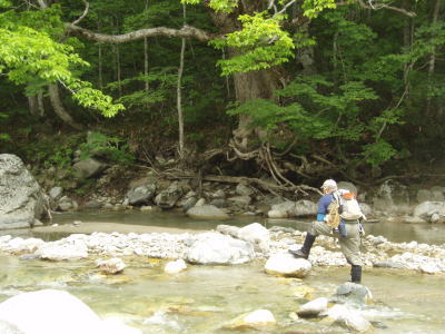 名藤さんの車で出発。40pのイワナが釣れるというM川に向かう。