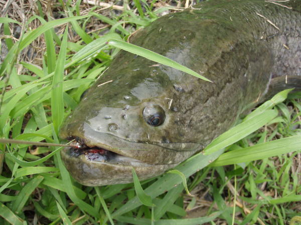 でも次のアタックはみごとにフッキング。そんなに大きくない。岸にあげてみると60センチくらいか。でも1匹は1匹。