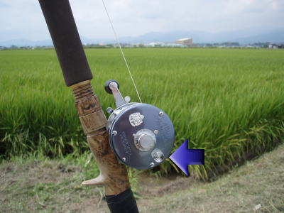 「アブのリールはライギョ専用ではないですよね。普通の釣りに使う人もいるんです。魚が針にかかってラインを引っ張ると音がして、釣れたのがわかるようになっているんです。置き竿に付ける鈴みたいなもんです。」