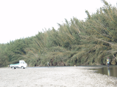 朝から何本か上がっているが、釣れたのはいずれも上流の川幅が5mくらいしかない狭いところだ。見ていると、そこにフライを投げ込んでアウトリガーのようにして釣っている。