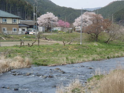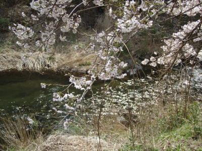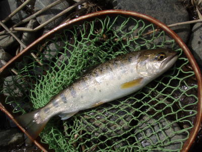 漁業の方に案内されて鮫川に入る。ハッチがたくさんあり、なんなく5〜6匹の山女魚を釣る。