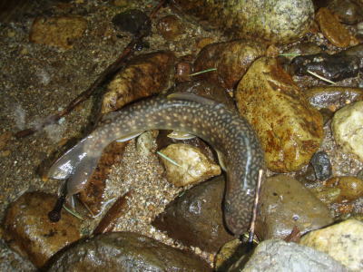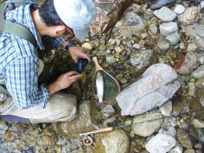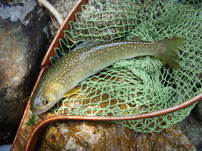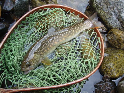 | 釣れた! でもイワナの頭の上、 ネットが折れてます。 |