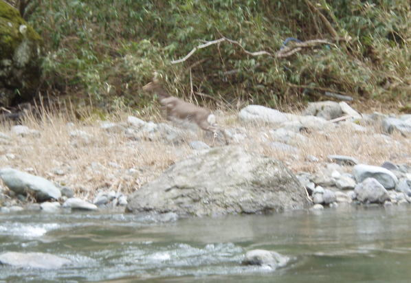 鹿は私と目が合うといきなりダッシュ。崖を駆け下り、私が釣ろうと思っていた川の中に思いっきりダイブした。