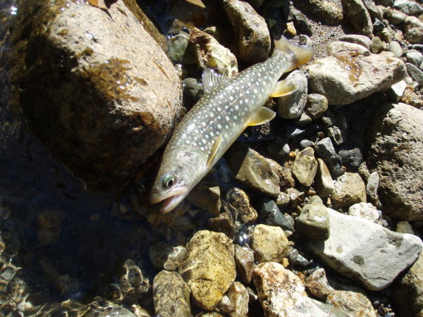 慎重にロッドを振り、イワナの少し上流にドライフライを落とすと、うまく流れてばくっと食いついた。それっと合わせる。