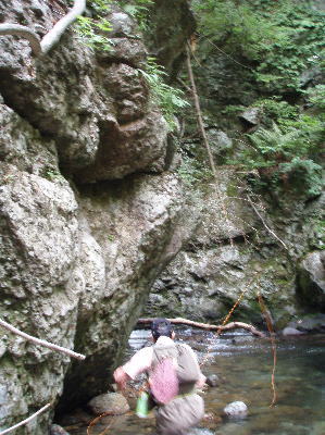 そろそろ今日の釣りも終盤というところでゴルジュにさしかかる。ゴルジュというのはV字谷とも言い、川の両側が切り立った地形のこと。