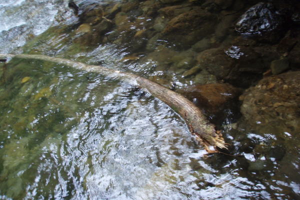 ここはそれほど減水しているようには見えなかったが、魚は神経質。結局、スレを除いて1匹も釣れなかった。
