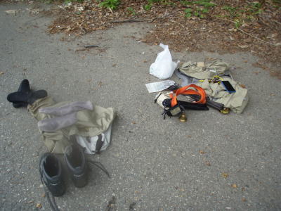 歩くことに問題はなかったが、一美さんに入渓点においた車を取りに行ってもらう。道路わきの駐車スペースでウェーダーを脱ぎ、地面に座って一美さんを待った。
