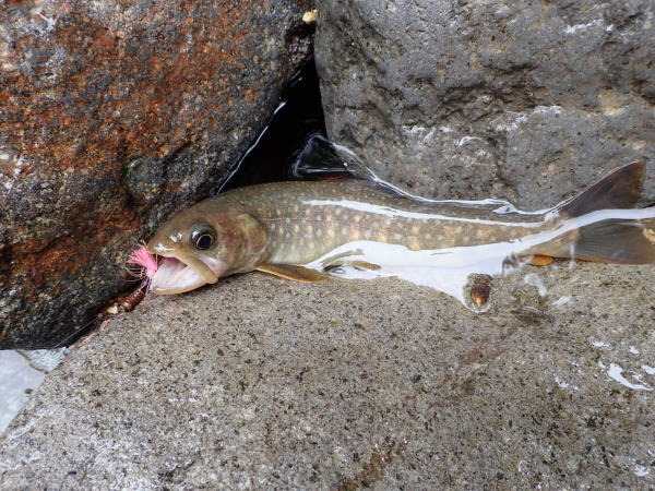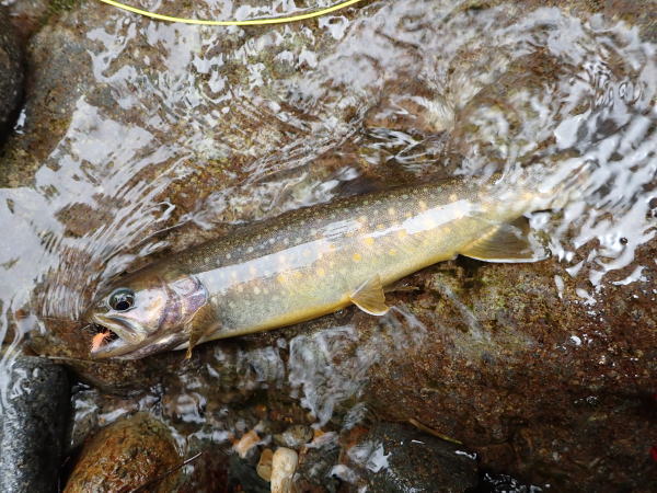 すると、大きなイワナが水面に顔を出してフライに食らいついた。