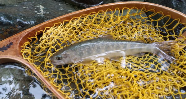ばしゃっと釣れたのは、やや悲しそうな顔をしたイワナ。