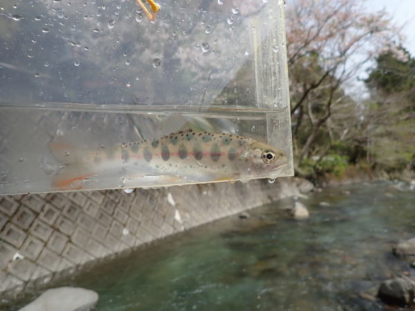 深いところを重点的に流していく。すると、ばしゃっと反応があり、小さなアマゴを捕獲。