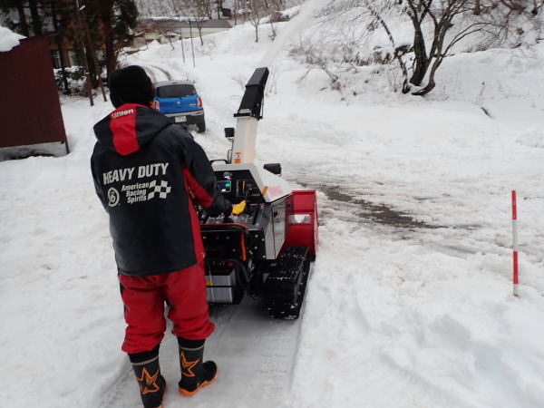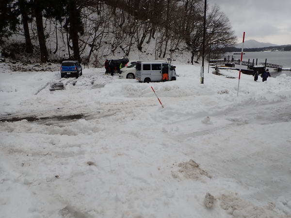 (左)みんなでボートの雪を捨てる。 (下)村営駐車場。急に降ったので除雪が間に合っていないとのこと。 |