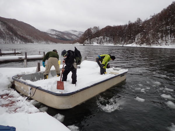早朝、一美さんとワカサギ釣りの集合場所である村営駐車場に行きましたが、駐車場は雪に埋もれ、屋形船に渡るためのボートにも雪がみっしり。