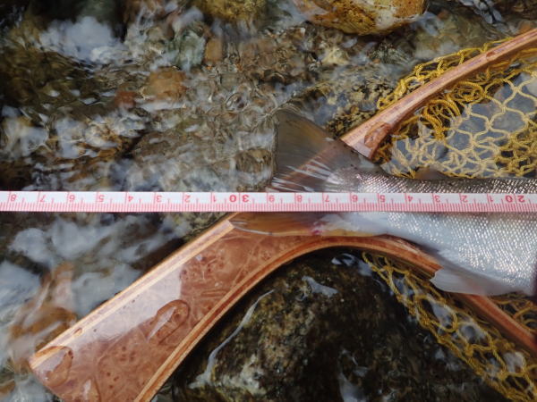 しかし、再度流すと今度は長い距離を追ってきて、2回食いそこねました。ただ、今度は少し下流の石の前に定位したので、こちらからよく見えます。